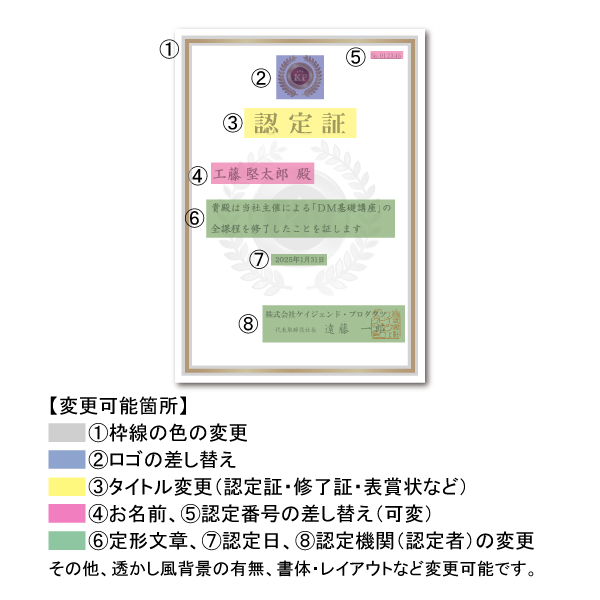 枠線の色・ロゴ・固定文書の差し替え、お名前・認定番号などの可変印刷、フォントやレイアウトの変更が可能です。