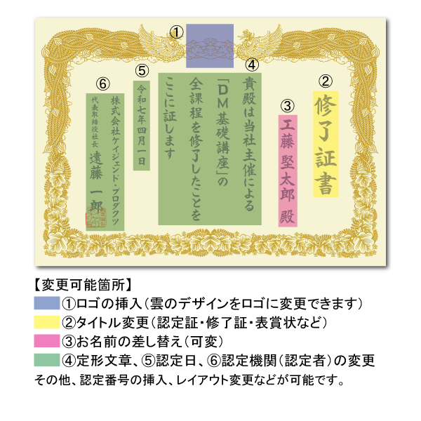 ロゴの挿入、固定文書の差し替え、お名前・認定番号などの可変印刷、フォントやレイアウトの変更が可能です。