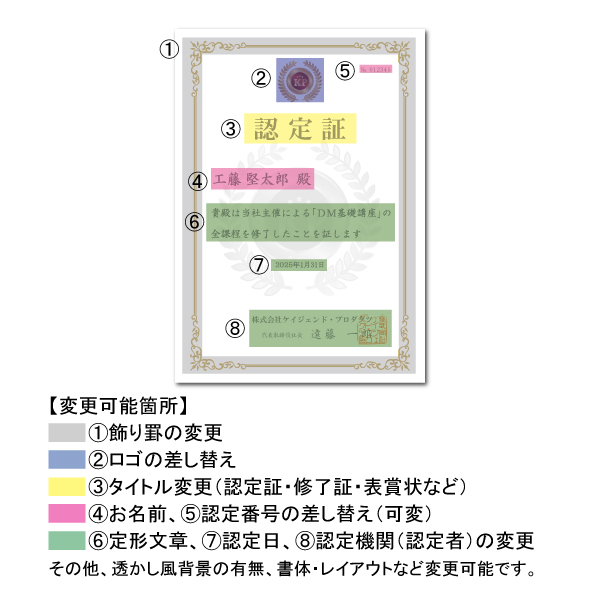 飾り罫の変更、ロゴ・固定文書の差し替え、お名前・認定番号などの可変印刷、フォントやレイアウトの変更が可能です。